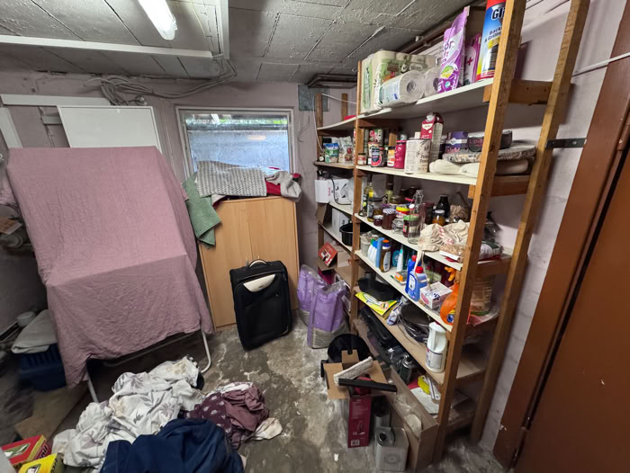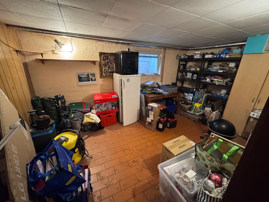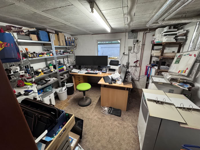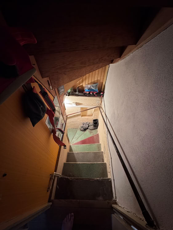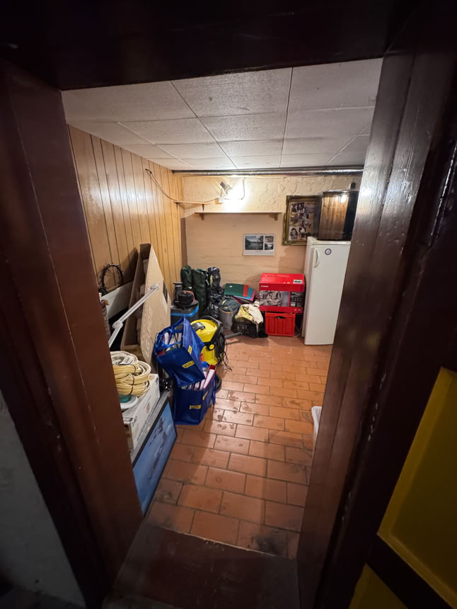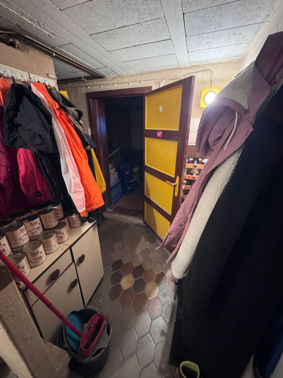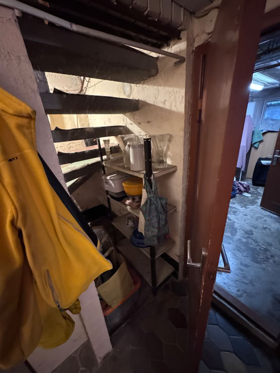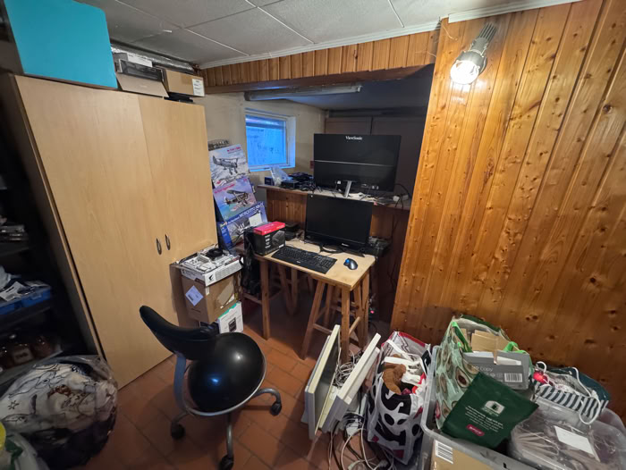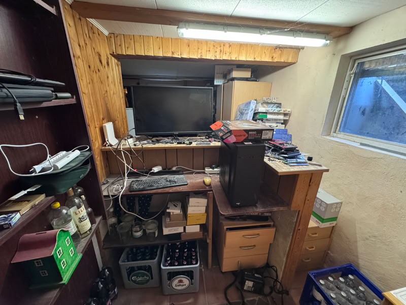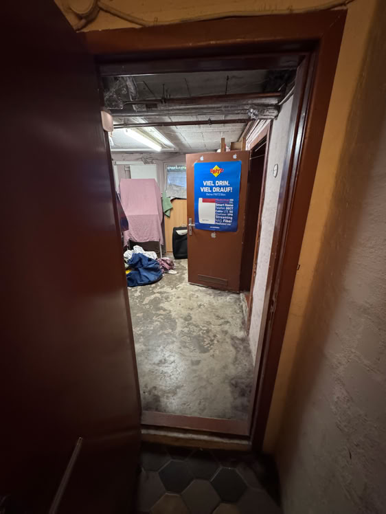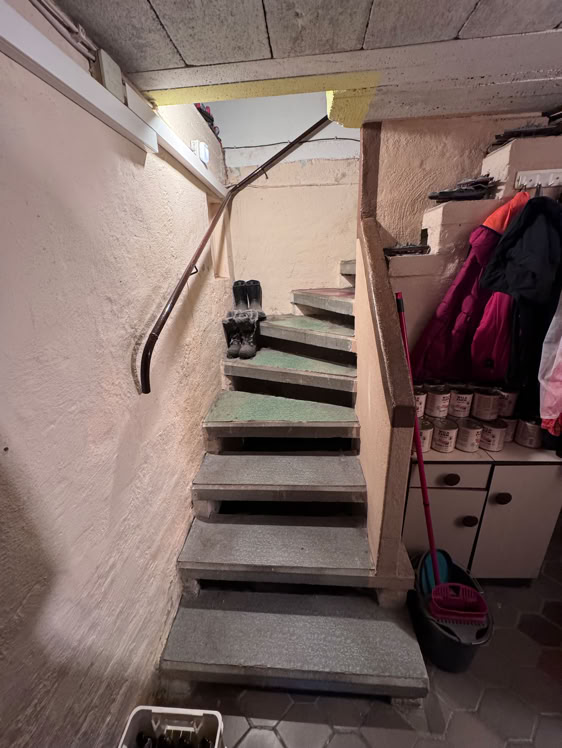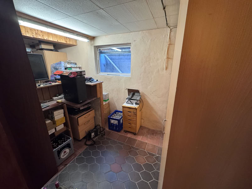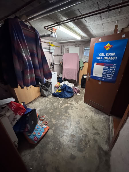 Und hier geht es jetzt in den Keller, dort war früher mal ein Partykeller. Jetzt Waschküche, Heizung (mein Büro) und meine provisorische Werkstatt.